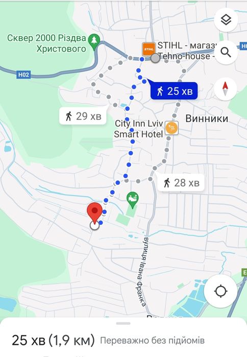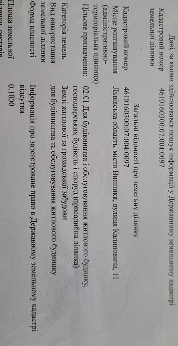 Ділянка під житлову забудову Лвів (Винники); Чудова, рівна, кутова з видом на гору ділянка в 10 сотих за адресою вулиця Калиновича 13 (біля стадіону Б. Маркевича) . Майже центральна частина Винник . До оперного театру 11 км . За рік-два поряд буде парк про що свідчить план розбудови. В пішій доступності є свдочок та школа. Є всі міські комунікації: вода, каналізація, світло, газ. Гарний доїзд, асфальт та невеликий шматок вимощеною цебнем дорогою. Поряд мешкають сусіди. На ділянці присутній електричний стовп який потрібно перенести тому можливий торг. Ціна за сотку.