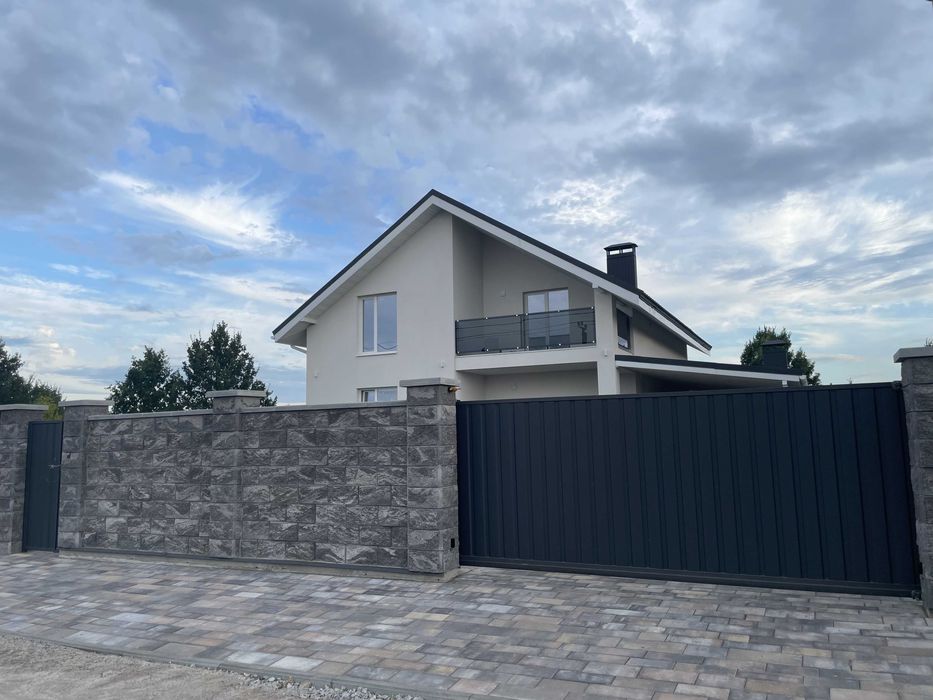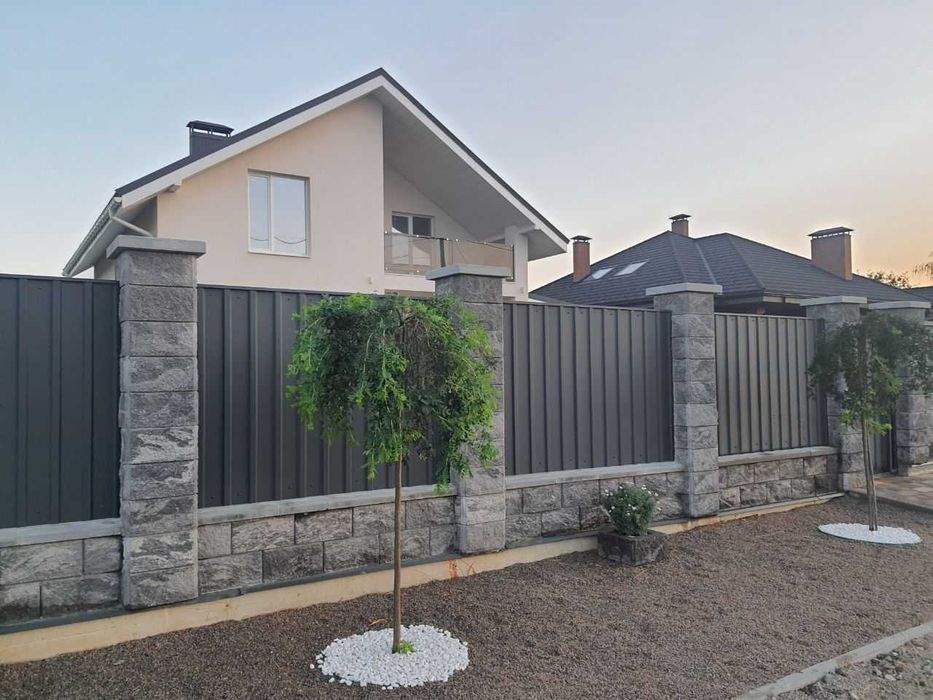 Паркан 2,2м з блоків Золотий Мандарин. Озелення зони при дорозі. Відкатні ворота на автоматиці.
