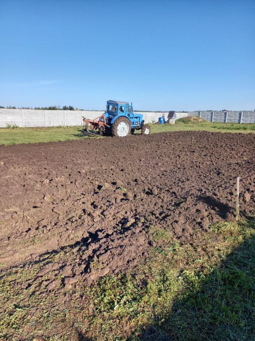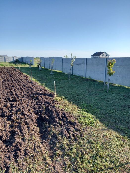 Ділянка рівна, правильної форми, кутова огорожена бетоним забором, є колодязь, посаджено молоді плодові дерева.