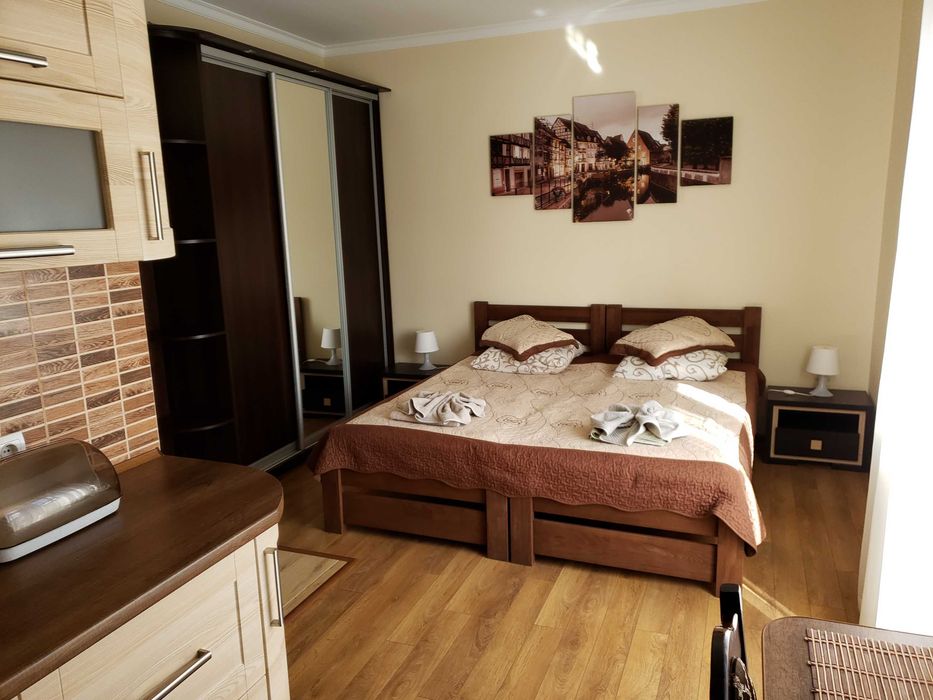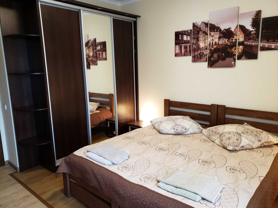 Квартира з балконом, роздільним санвузлом з душовою кабіною (гаряча вода цілодобово), є інтернет, Wi-Fi, кабельне телебачення, великий сучасний телевізор, підключений до інтернету, холодильник, мікрохвильова піч, електрочайник, посуд.