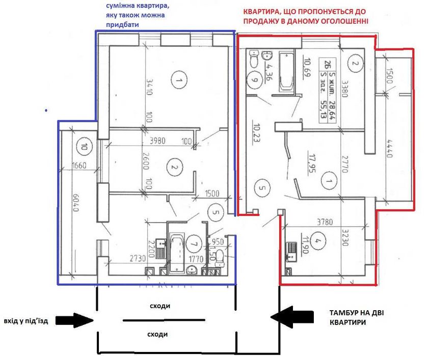 !!!Суміжна двокімнатна квартира площею 61.90 кв.м квартира також в продажу!!! Купуючи одночасно дві квартири, тамбур між двома квартирами площею близько 8 кв.м. переходить в розпорядження одного власника.