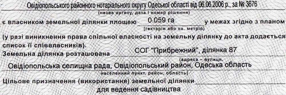 Адреса: Одеська область, Овідіопольський район, Овідіпольська селищна рада, СОГ "Прибрежний", діл. №87; кадастровий номер: 5123755100010030363