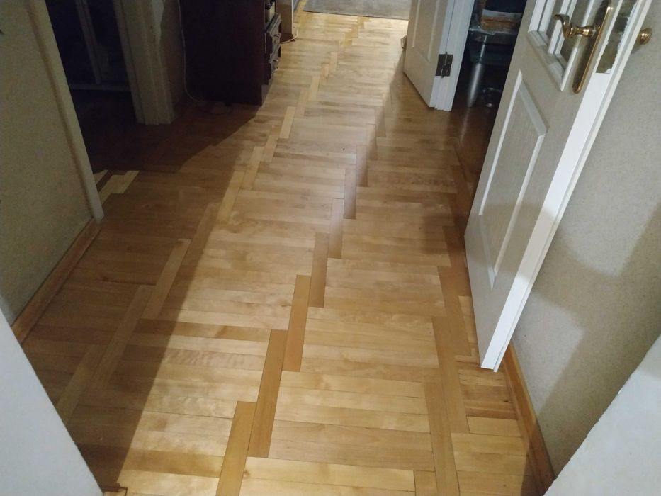 Во всех комнатах-паркет, на кухне-кафель.