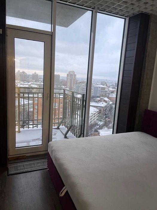 Вітальня з панорамними вікнами та окремою кухнею, спальнею, санвузлом і гардеробом.