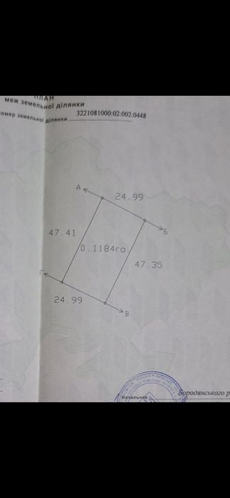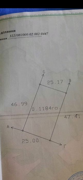 Земельна ділянка правильної прямокутної форми 50х50 кв.м. Цільове призначення земельної ділянки для ведення садівництва. Кадастрові номери земельних ділянок 3221081000:02:002:0447 і 3221081000:02:002:0448. Вся ділянка оброблялася багато років, очищалася від бур'янів, був фруктовий сад з плодовими деревами, город, були ягідники з суницею, малиною, ожиною, порічкою, агрусом. В 2025 році ділянка не оброблялася.