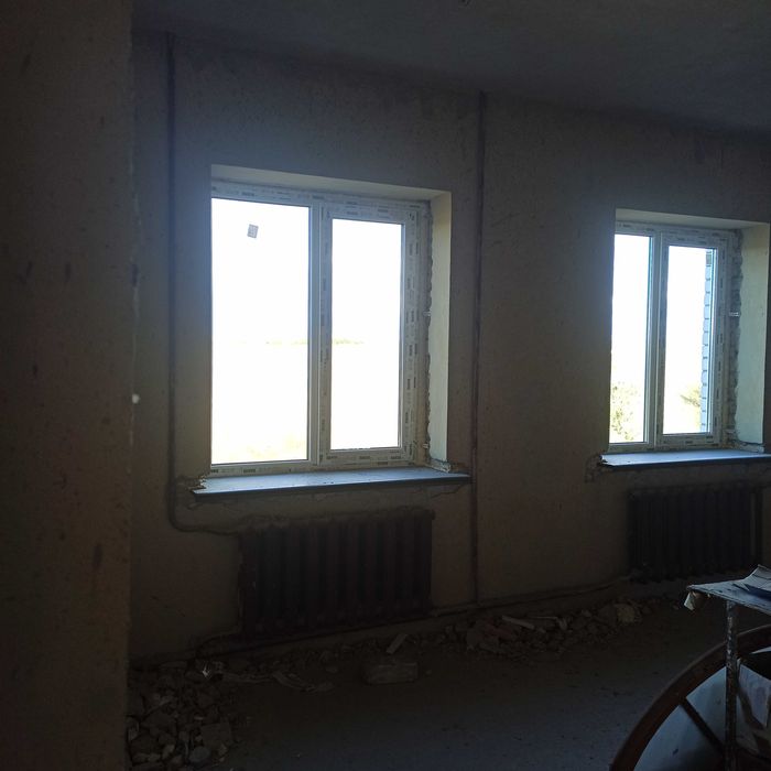 Сделана разводка системы отопления с радиаторами, разводка электрики, воды/канализации, везде есть стяжка на полу, стены оштукатурены.