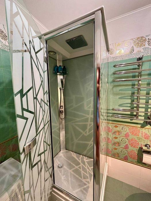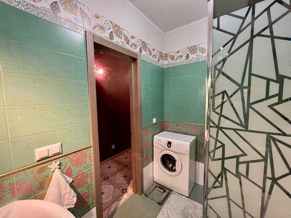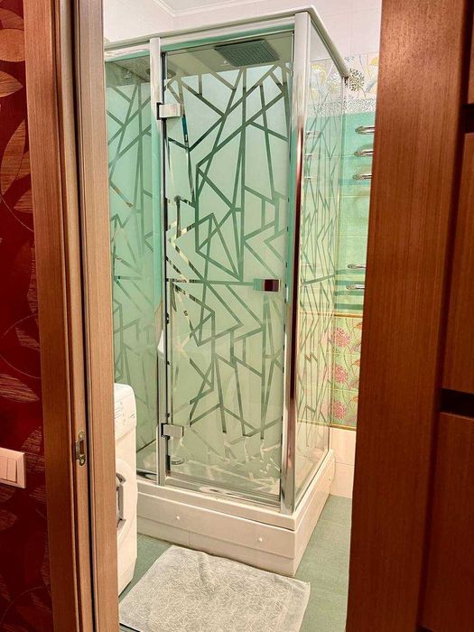 ІV. Вбиральня: душова кабіна з верхньою лійкою "краплі дощу" та ручним душем. Біде. Дуже простора раковина, дизайнерський унітаз, величезне здеркало, розетки. Дуже якіска сантехніка. Є все для прибирання: чудо-швабра, мітла та ін.