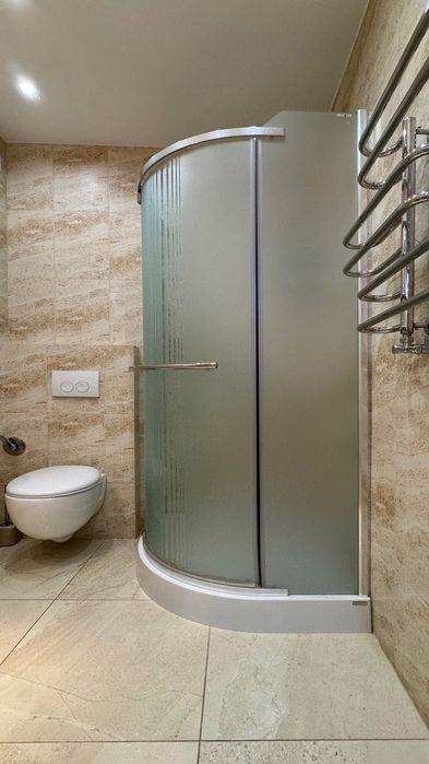 1-й на першому поверсі облаштований теплою підлогою, душова кабіна та вмонтована система Grohe, водяна та електрична сушка для рушників.
