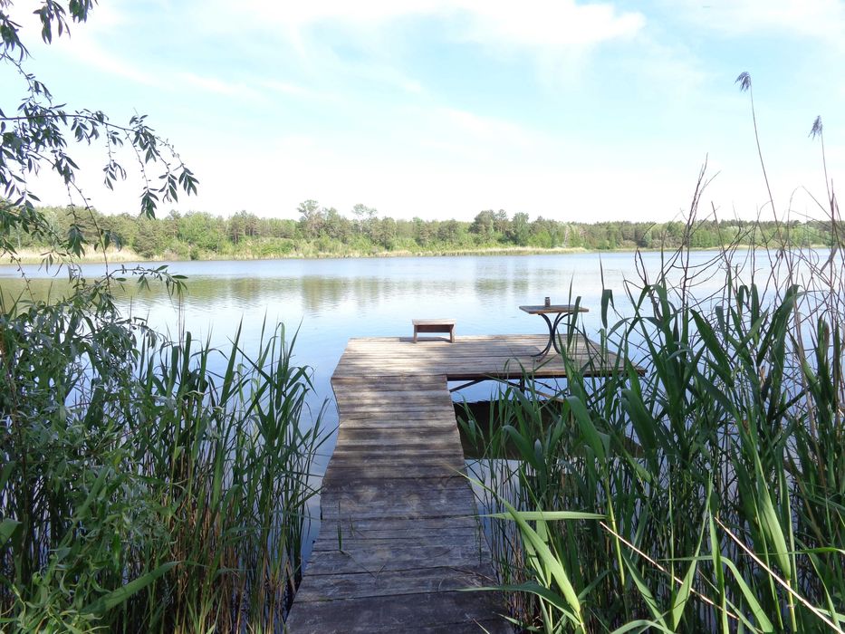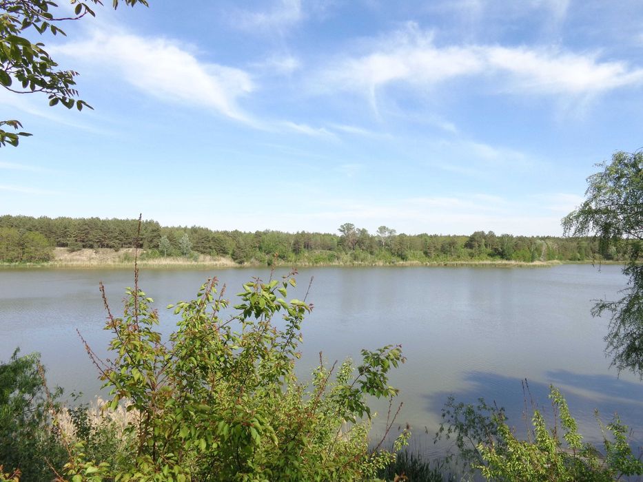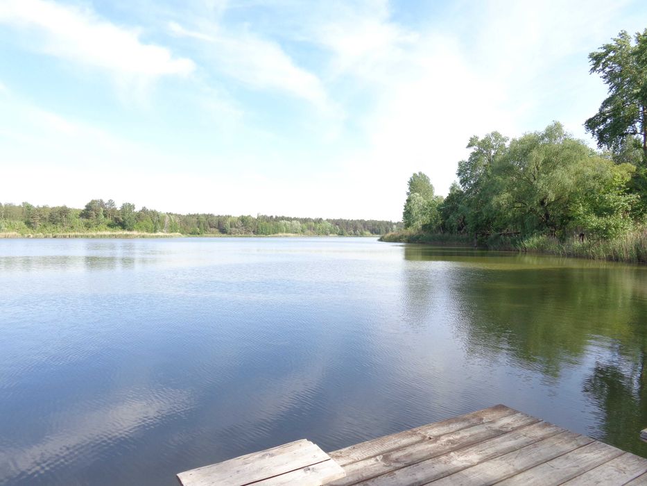 На протилежному березі озера масив соснового лісу – тиша, чисте повітря, піщаний берег.