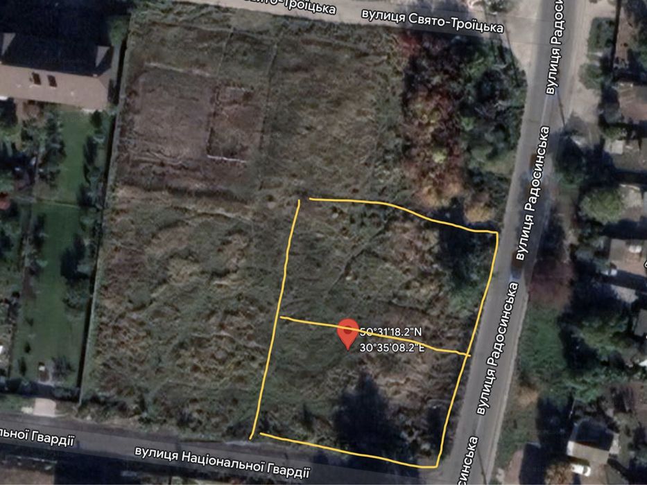 Деснянський; Участок на Троещине; Киев, Деснянский р.н. Троещина., ул. Радосинская. Участок под застройку 20-соток правильной формы, можно по-10с. Коммуникации все рядом. Возможно расширение. 10000$ за-сотку.; кадастровий номер: 8 000 000 000:62:177:0010