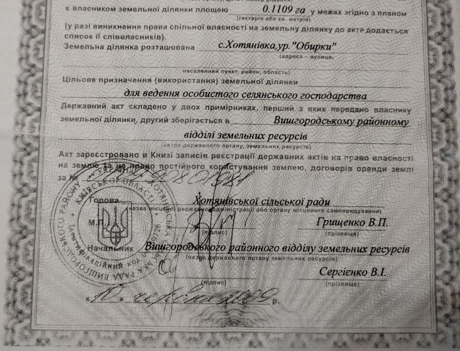 Продається земельна ділянка в селі Хотянівка; Продається земельна ділянка в селі Хотянівка, ОСГ. 11 соток. Поряд інтенсивно забудовуються ділянки. 50 метрів від ділянки електрика. Земля знаходиться недалеко від центральної траси. Поруч обвідний канал. Пішим ходом 5 хвилин до магазину Фора. За бажанням можна придбати сусідню ділянку. Продаж від господаря. 1 100 доларів за сотку. Номер телефону: 09******33.; кадастровий номер: 3221888801 37 052 0235