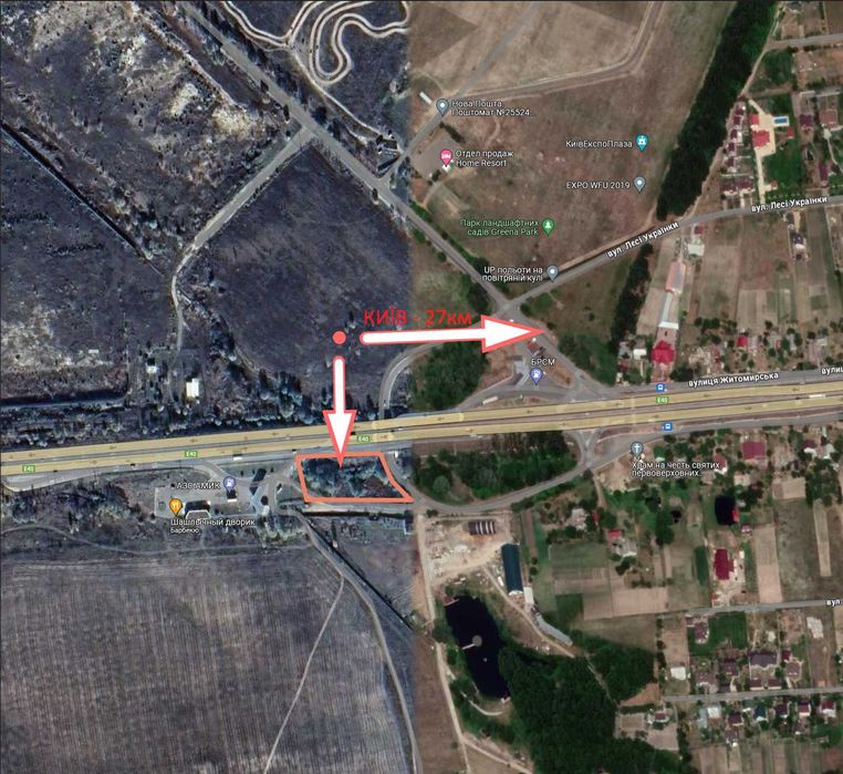 Фасадна ділянка - Житомирська траса - Київ-27км; Ділянка розміром 0.417Га - фасад траси Житомир - Київ. До Києва 27км.