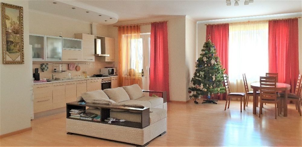 В квартире большая гостиная и три раздельные спальные комнаты.