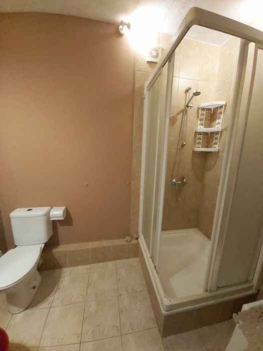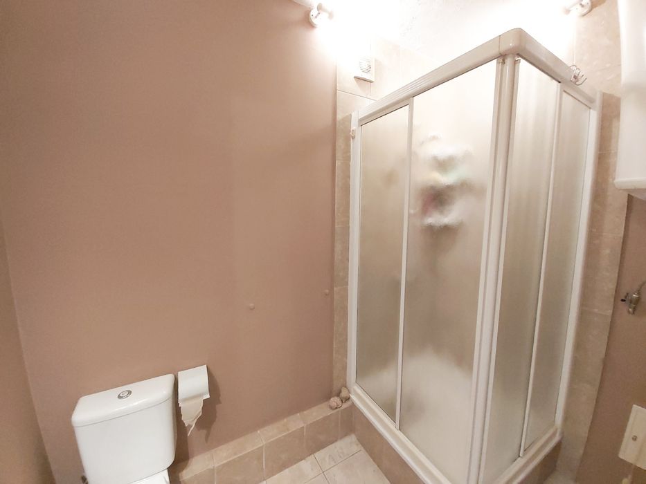 Душевая кабинка стационарная с душевой системой (стекло тонированное),смесители, удобные угловые полочки.