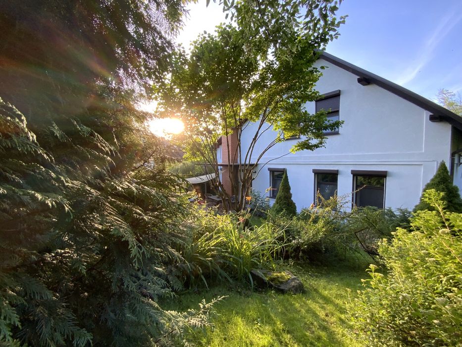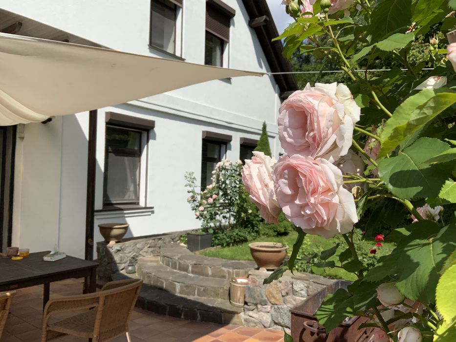 У будинку 5 кімнат: кухня- їдальня 24 м, вітальня 30 м, спальня господарів 36 м, дитяча 24 м, гостьова спальня 20 м, кабінет 12 м, санвузли 12 м та 6 м. Підлога - скрізь, де плитка - герамограніт - з підігрівом. У великому санвузлі плитка на полу Villeroy& Boch, на стінах плитка Португалія. У всіх кімнатах - натуральна дубова паркетна дошка. Кондиціонери - Daikin, працюють і на підігрів. Сантехніка Grohe, Blanko, Kolo. Великий комин на кухні- діючий. Захисні металеві автоматичні ролети на всіх вікнах. Нова сауна на дровах з окремою душкабіною в цокольному поверсі. Сигналізація, тривожна кнопка ДСО. Автополив та дорогий ландшафтний дизайн усієї ділянки. Опалення- газовий котел Vaillant, бойлер Vaillant на 150 літрів, велика посудомійна машина, пральна машина АЕG, потужний стабілізатор напруги,вода - міський водопровід, але із артезіанської свердловини.