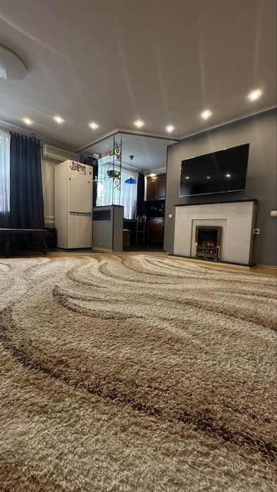 У залі ламінат, диван, телевізор, кондиціонер, холодильник та камін (в робочому стані).