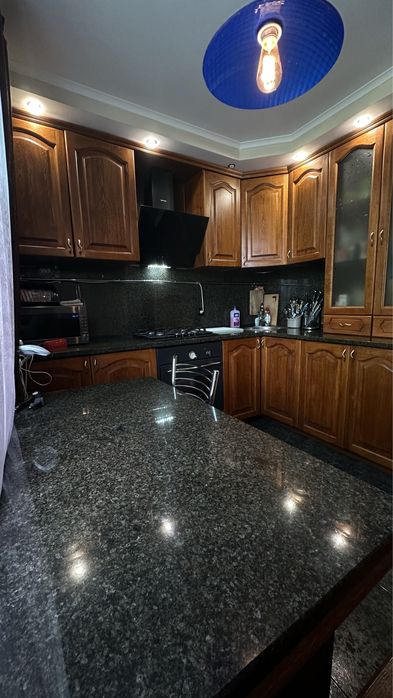 Вбудована кухня із технікою. У кухні тепла підлога, (стіл, стільниця та підвіконня в квартирі з граніту), духова шафа, варильна поверхня, витяжка та мікрохвильова піч.