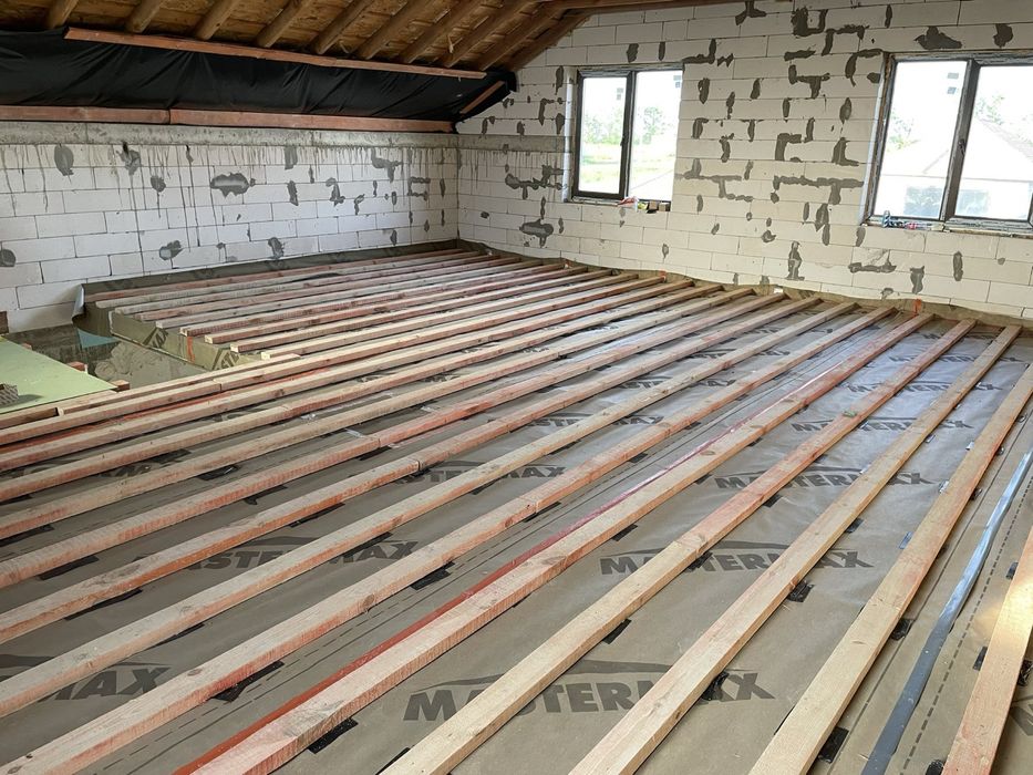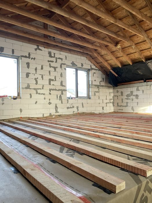 Будинок: крівля - бітумна черепиця; 2 поверхи, верхній мансардний; підлога деревʼяна, утеплена та шумо ізольована (акустична вата кнауф 200мм, пароізоляція, гідроізоляція+терафом) усе дерево оброблено біо/вогнезахистом. Вікна двокамерні. На першому поверсі чорнова підлога.
