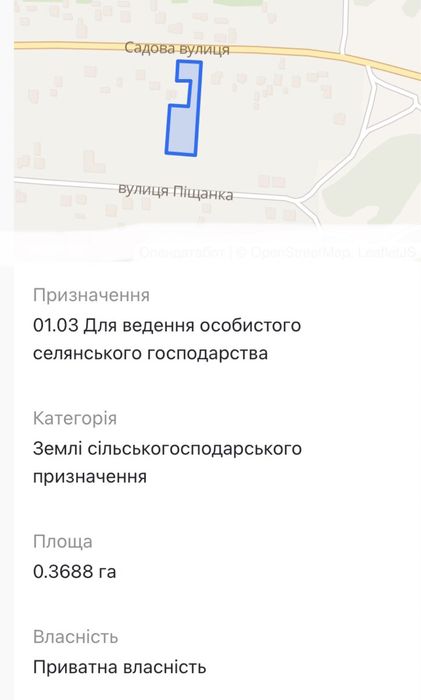 Земельна ділянка м. Пустомити; Земельна ділянка по вул. Садова у м. Пустомити, загальною площею 47 сотих, з яких 36,88 сотих - для ведення особистого селянського