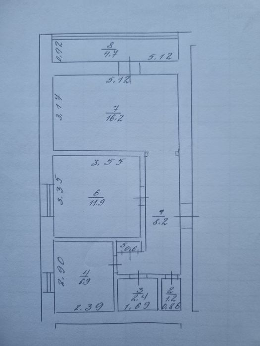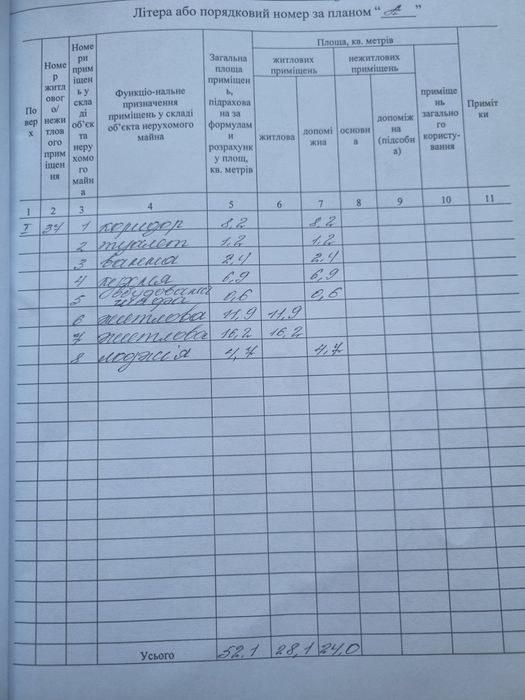 Загальною площею 52,1м², складається з: кімнати пл.-16.2м², кімнати пл.- 11.9м²,кухні пл.-6.9м², коридору пл.-8.2м², ванної пл.-2.4м², туалету пл.-1.2м², вбудованої шафи пл.-0.6м², лоджії пл.-4.7м².
