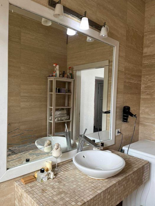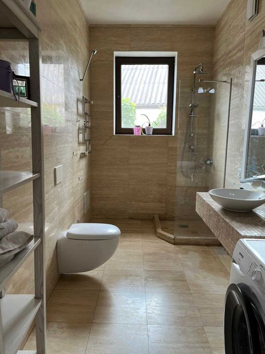 А також санвузол з теплою підлогою та душем, ванна кімната обкладена каменем-травентином, що дозволяє взимку добре тримати тепло, а влітку прохолоду!