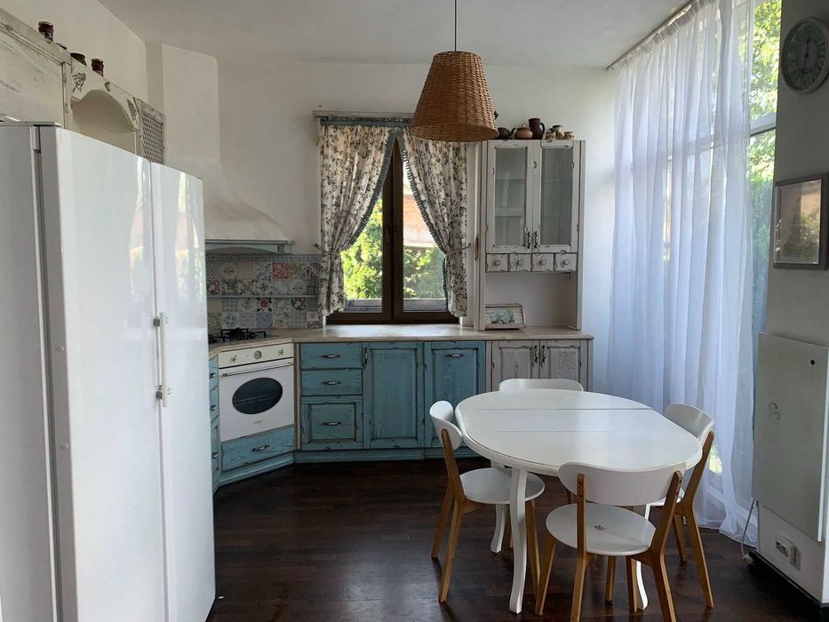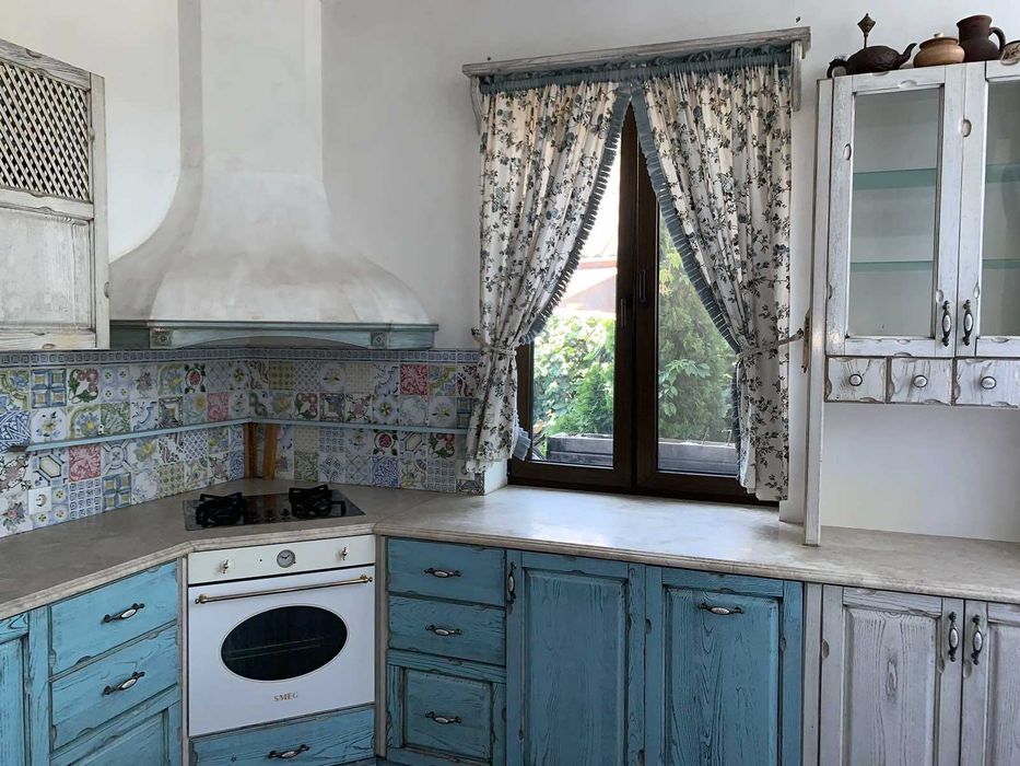 1 поверх: Велика кухня - вітальня з вбудованою технікою, виконана в стилі «Прованс». Дерев'яна Кухня з мармуровою стільницею, служитиме Вам довгі роки. Камін обкладений травентином та мармуром.