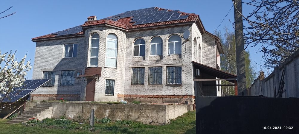 Продам великий будинок в Курилівці з сонячною станцією; Будинок знаходиться в Курилівці в кроковій доступності до лівого берега м. Кам'янське, поруч з Курилівським котлованом. Двоповерховий будинок, розміром 21 х 17 метрів, розташований на земельній ділянці площею 25.3 сотки++, огорожений парканом з бетонних плит та червоної цегли в передній частині. На першому поверсі розташовано чотири великі кімнати, кухня - студія, велика ванна, прихожа, огромний хол та гараж на дві машини. На другому поверсі такої ж площі розмістилося п'ять великих кімнат, ванна кімната 16 м2 та величезний хол. Другий поверх потребує додаткових оздоблювальних робіт. Майже під всією площею будинку розташований бетонний підвал з бойлерною, трубною розв'язкою опалення, води, каналізації та електричної частини і п'ятьма кімнатами з великим холом. Два газових котла опалення. На першому та другому поверсі обладнано обігрів приміщень батареями та облаштовано теплі поли. На першому поверсі в кімнатах встановлено три кондиціонери, в усіх кімнатах великі вікна. На земельній ділянці розташована сонячна станція під зелений тариф на 30 кВт, що дає можливість не тільки не платити за електроенергію, а і отримувати додатковий прибуток від виробленої зеленої електроенергії.