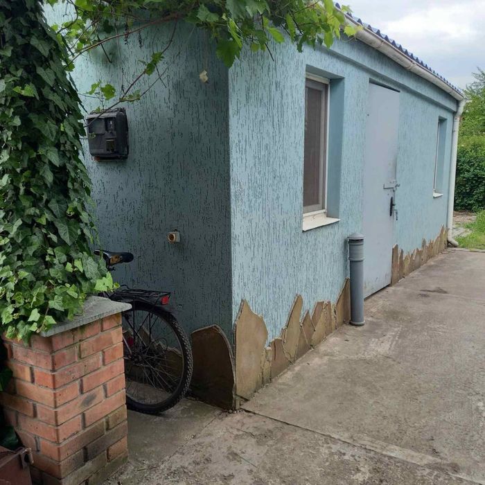 Наружная поверхность покрыта декоративной штукатуркой (“короед”) и окрашена водоотталкивающей краской. Внутри две комнаты с варочной поверхностью, холодильником, шкафами, диваном, столом. Под кухней есть подвал (3х3 м, высота 2 м).
