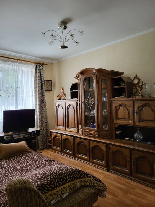 В одной половине — дубовая румынская спальня и витринная стенка-горка из натурального дуба.