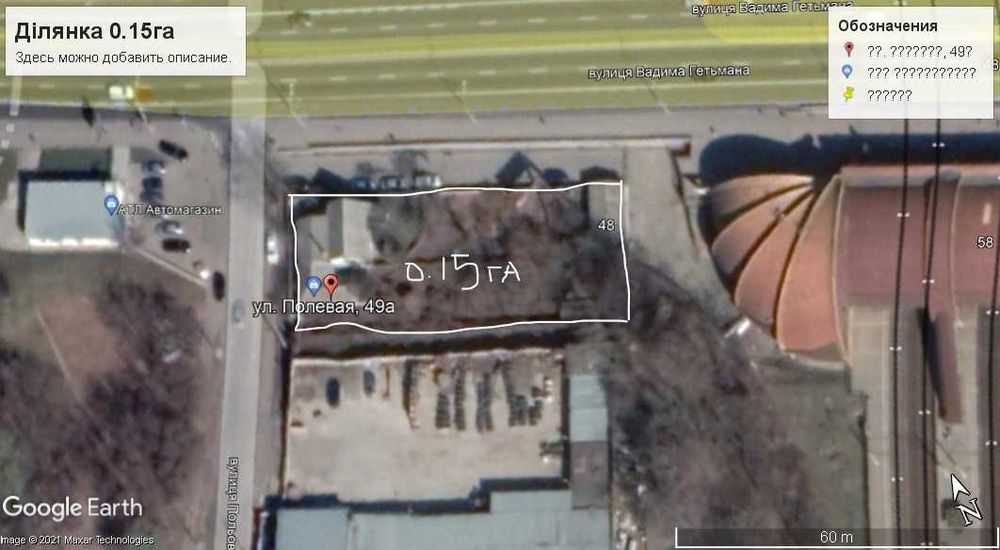 **Розташування:** Фасадне місце на жвавому перехресті вулиць В. Гетьмана і Польова. Прямокутна форма ділянки: 60 метрів вздовж вул. В. Гетьмана та 25 метрів вздовж вул. Польова.