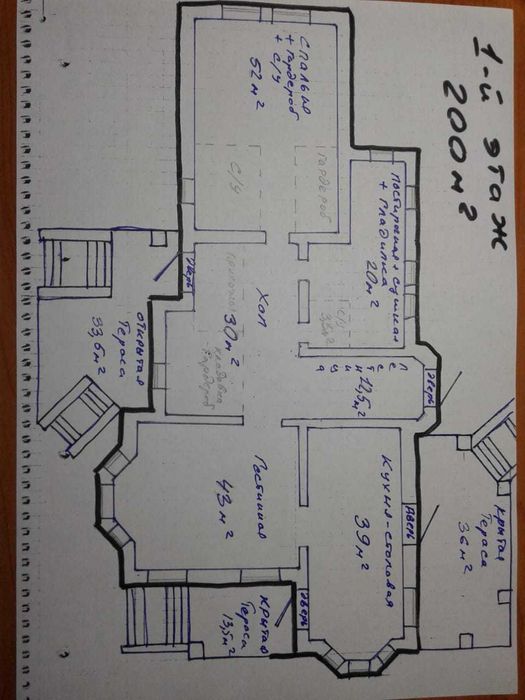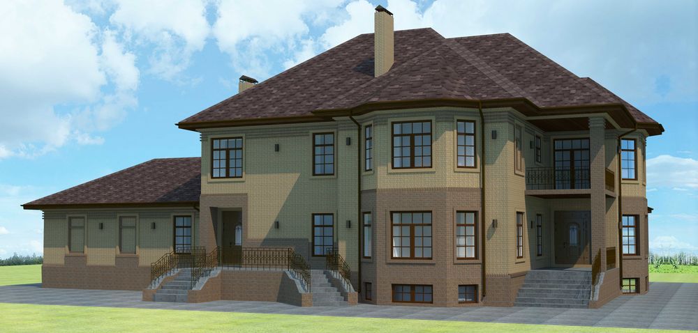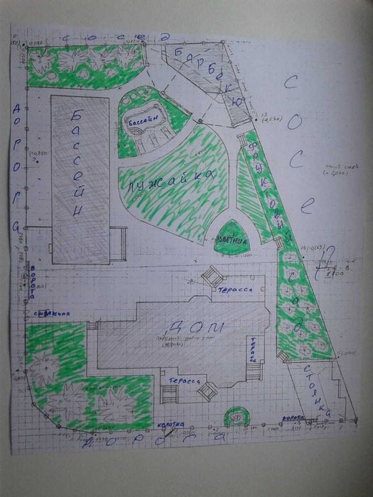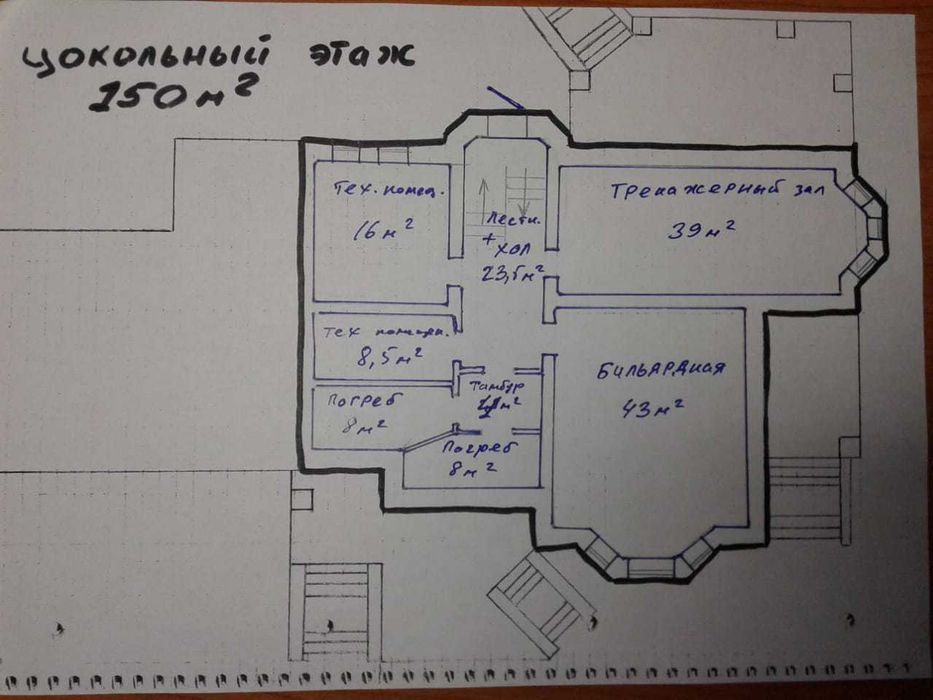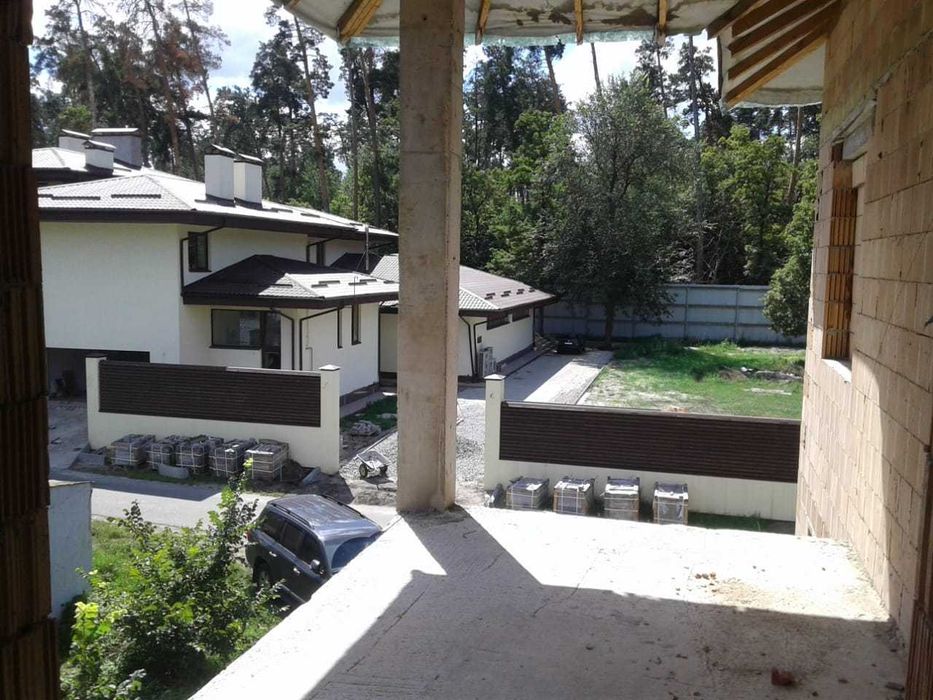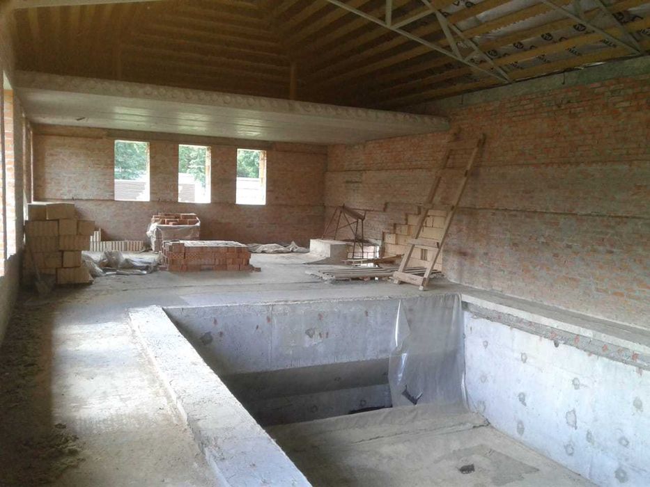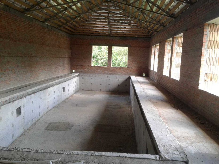 Будинок над землею 350 м2 + цоколь 150 м2. Будівля критого басейну, барбекю та вуличний басейн. Будинок та критий басейн - коробки з дахом, барбекю - фундамент (можна розібрати чи побудувати щось інше (наприклад госьтовий будинок)), вуличний басейн -залита чаша.