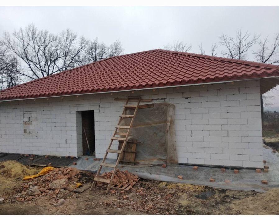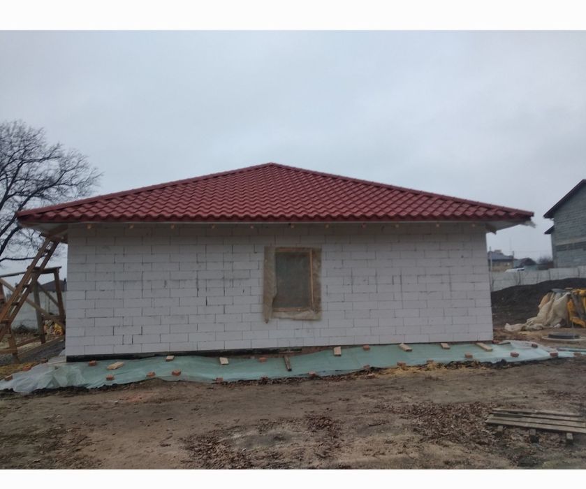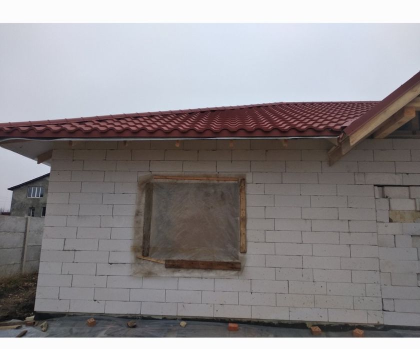 Качественный газобетон UDK 400 мм, перегородки внутри-полнотелый кирпич. Внутри залит черновой пол и проложены каннализационные трубы Армопояс. Крыша-качественная немецкая металлочерепица Тиссен 0,5 мм. Участок 10 соток по документам. Есть большая свободная территория между участком и дорогой. В конце участка дубовые деревья.