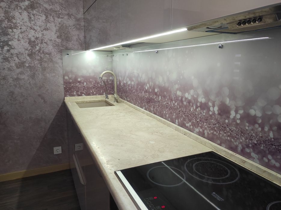 7)Кухню, вбудовані шафи зроблені по індивідуальному проекту з використанням найдорожчих матеріалів, мармурової столешні та скляних фасадів.