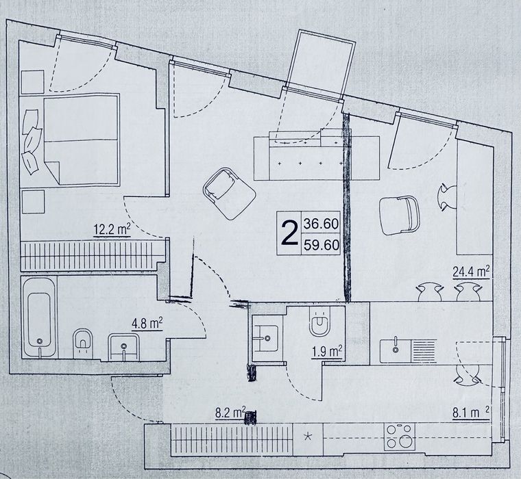 Планування ; дві спальних кімнати ; студіо ; два санвузли ; балкон .