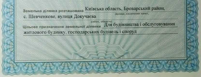 Продам земельну ділянку (с.Шевченкове, Броварський р-н, Київська обл.); Земельна ділянка 12 соток в с. Шевченкове Броварського району Київської області (зал. станція "Бобрик", 26 км до м.Бровари, 38 км до м.Київ) до зупинки електрички 10-15 хв пішки, рівний, правильної форми (30 м х 40 м), рядом електрика (60 м до ділянки) і газ, асфальтована дорога (70 м), хороший під'їзд, оформлений державний акт під житлову забудову, власник, ціна 450 дол./сотка. Без торгу. Без посередників.