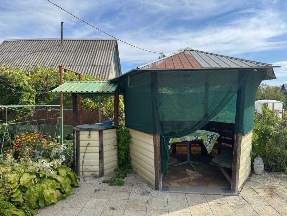 На участке - колодец с электронасосом, беседка, большая теплица, навес под машину, постройка на три секции (туалет с садовым унитазом, летний душ, сарай). Есть полив.