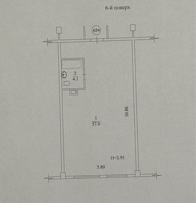 6-й поверх, по підлозі 61.1 кв.м. за техпаспортом (фактично більше) та висота стелі 4,6м, вільне планування.