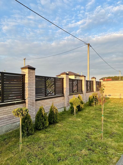 Огорожа з цегли, засіяний газон, висаджені дерева, ландшафт частково зроблений.