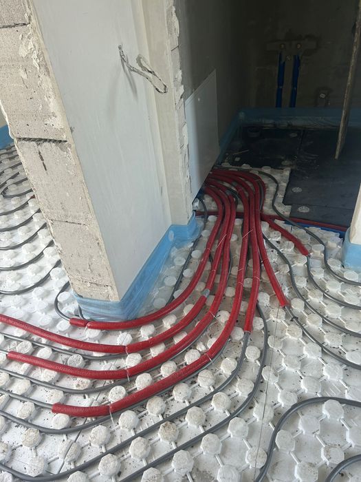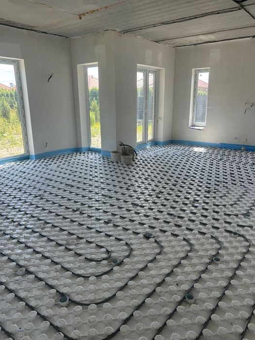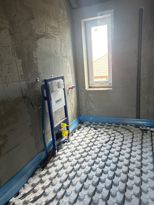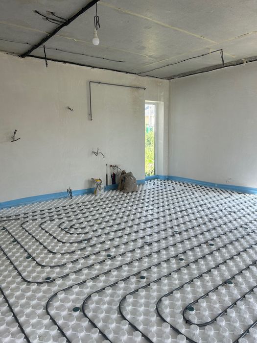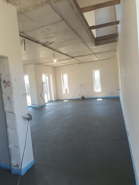 Розведено електрику, водопостачання, опалення, каналізацію, вставлена тепла водяна підлога на першому поверсі та закуплені радіатори для другого поверху, проведена штукатурка стін та стяжка підлоги