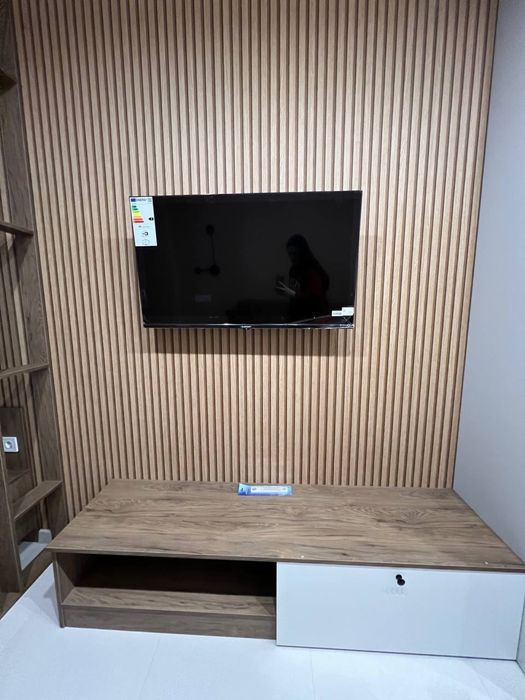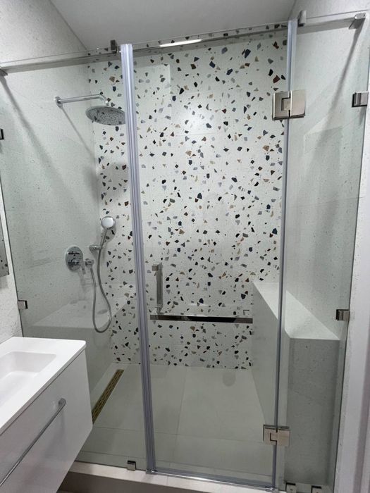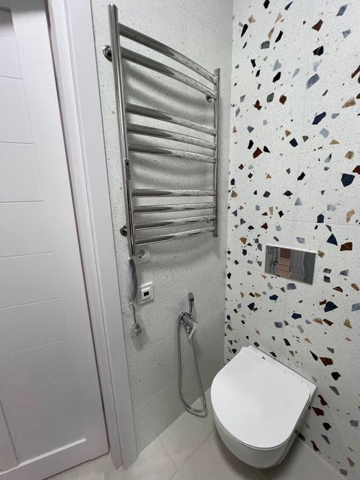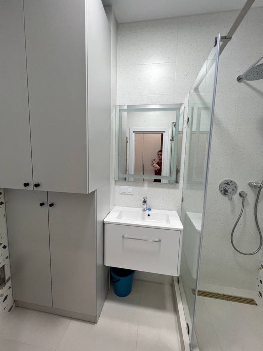 У с/у скляна душ кабіна, душ система прихованого монтажу, інсталяція, гігієн душ; елекрична рушникосушка; пральна машина та бойлер сховані в меблях.