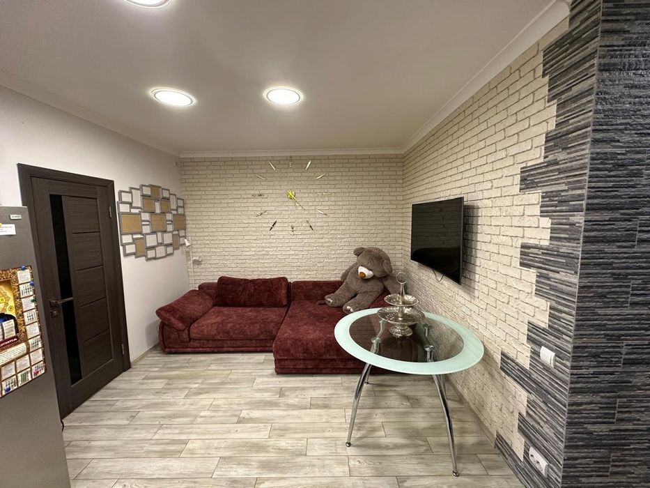 - Велика вітальня з підігрівом підлоги, великим диваном, скляним столом, великим телевізором, кондиціонером вбудованою кухнею та технікою.