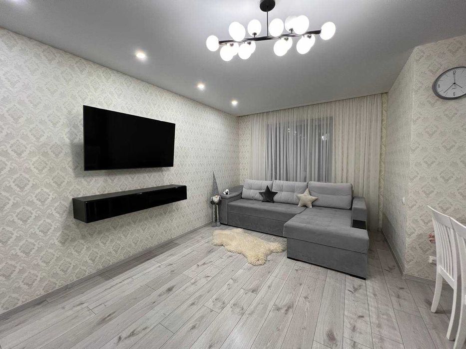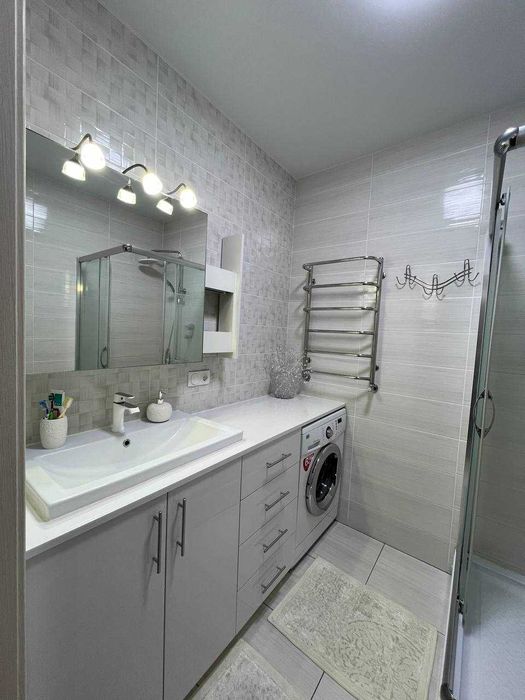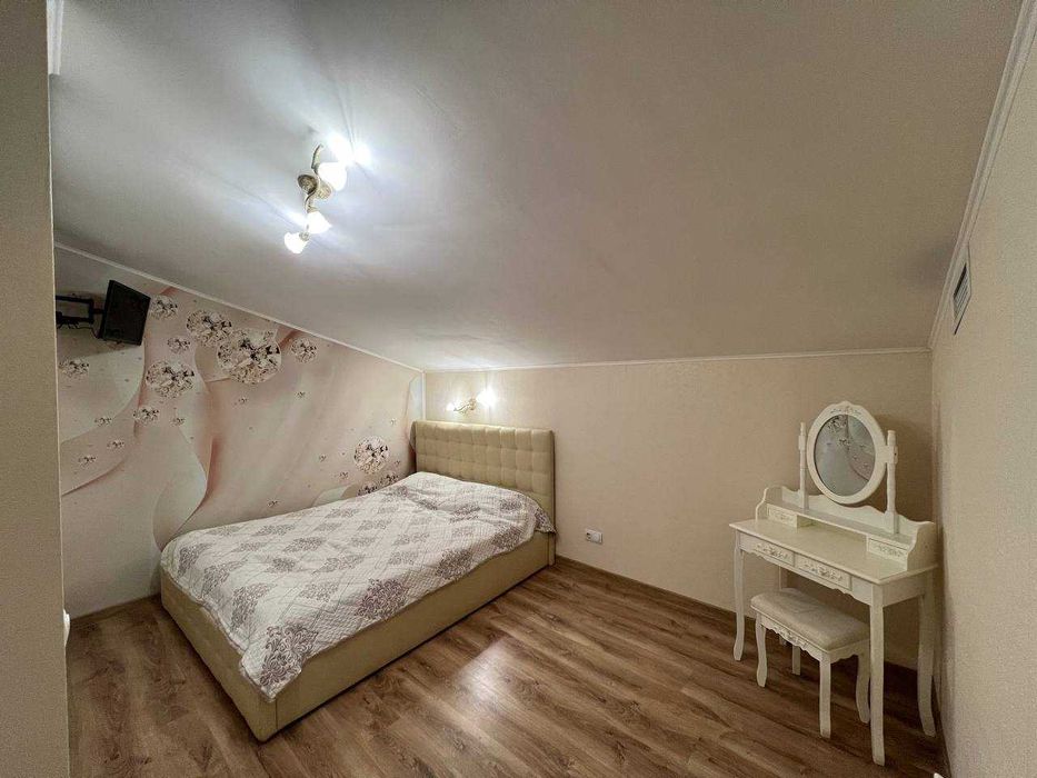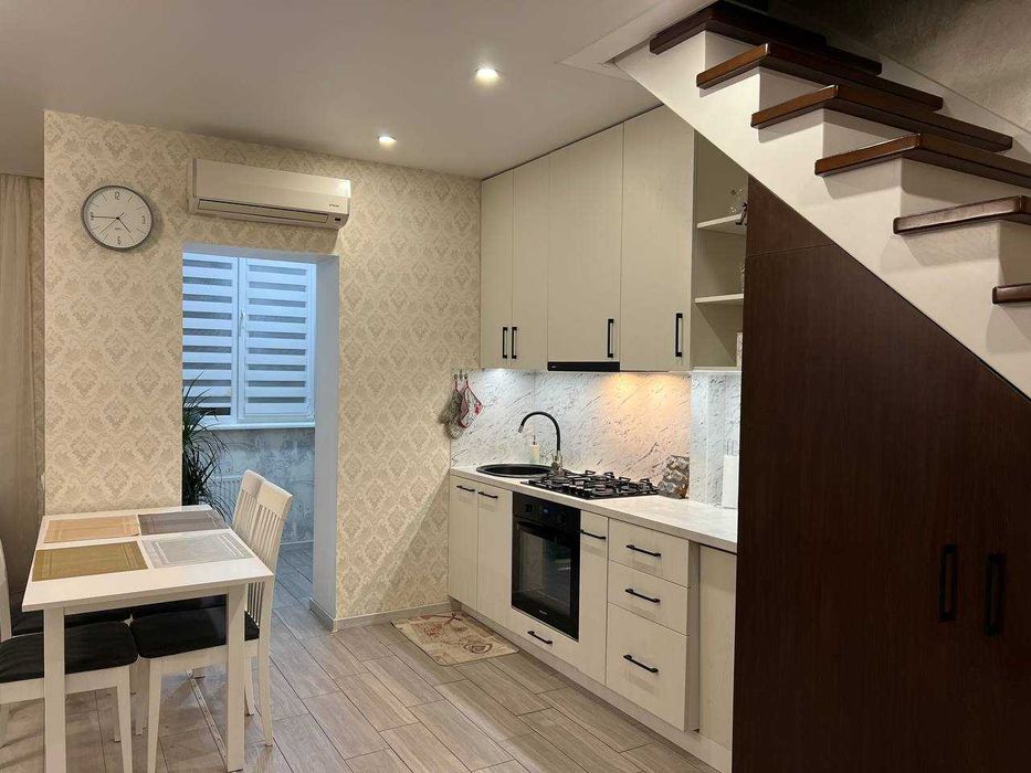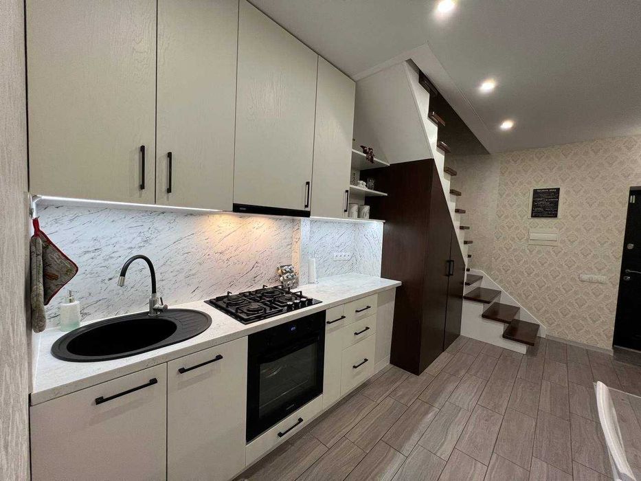 На першому поверсі розташована велика кухня-вітальня з сучасним плануванням. Є місце для посудомийної машини шириною 45 см із виведеними підключеннями, газова варочна поверхня. Під плиткою на кухні та ванній кімнаті встановлено теплу підлогу для максимального затишку. Квартира повністю мебльована і готова для проживання – вся побутова техніка у відмінному стані. Центральне водопостачання. У квартирі встановлено кондиціонер. Лоджія адаптована для зберігання кухонного приладдя та інших речей.