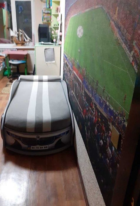 Дитяча кімната зі шведською стінкою, біговою доріжкою й ліжком-BMW.