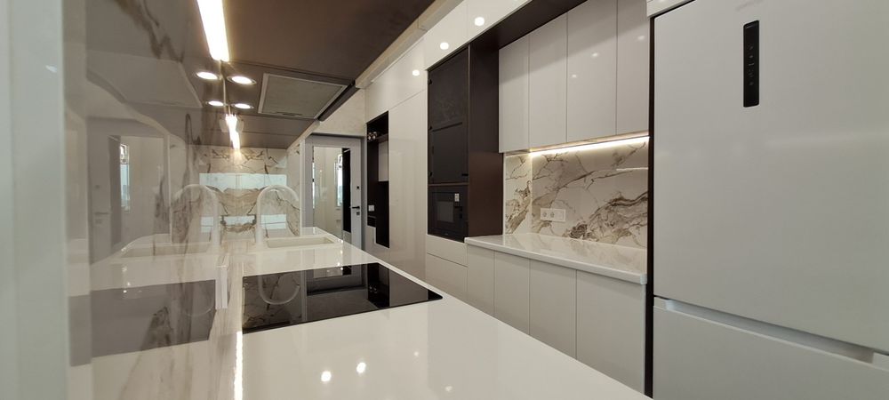 В великій кухонній зоні є повнорозмірний холодильник з окремою морозильною камерою, елетроплита 7кВт на 4 конфорки, посудомийна машина, вбудована сучасна мікрохвильова піч з великим набором функцій, є місце для встановлення духової шафи (при потребі).