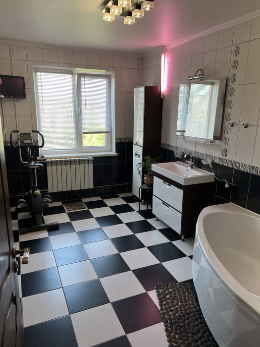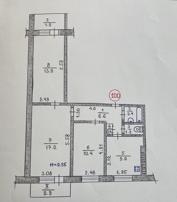 Квартира перепланована , на місці кімнати 10 м2 зробили ванну. Місце старої ванної кімнати займає гардероб для верхнього одягу .