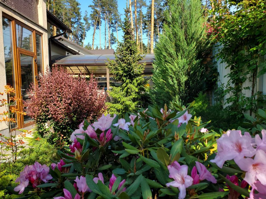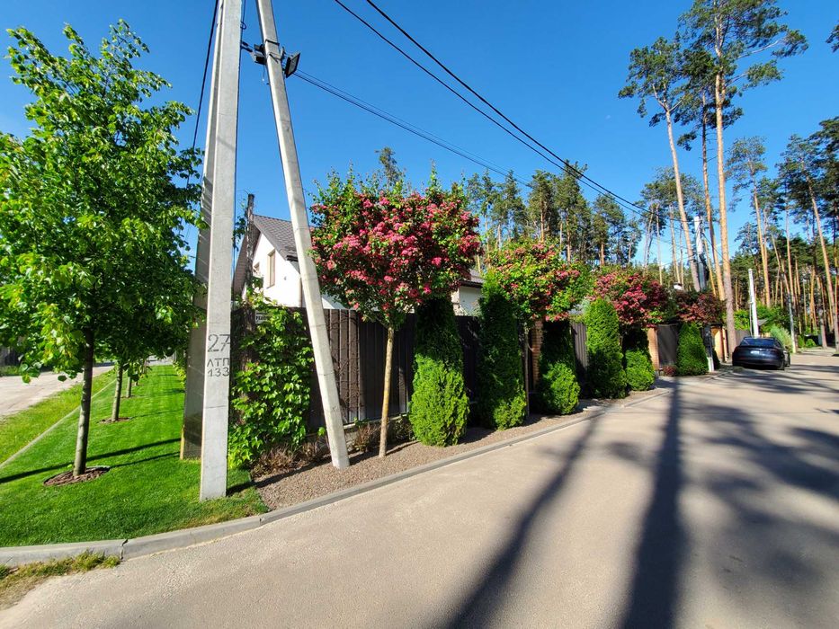 Земельна ділянка площею 5 соток з ландшафтним дизайном (дорослі декоративні дерева, газони, клумби з квітами) та системою автоматичного поливу.