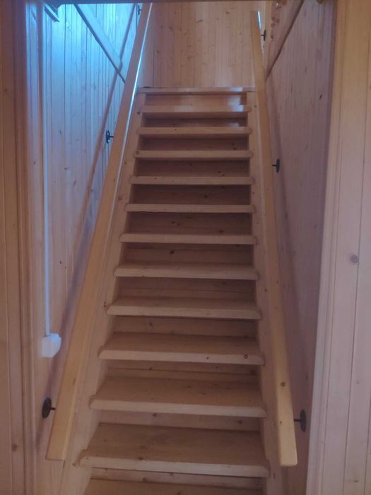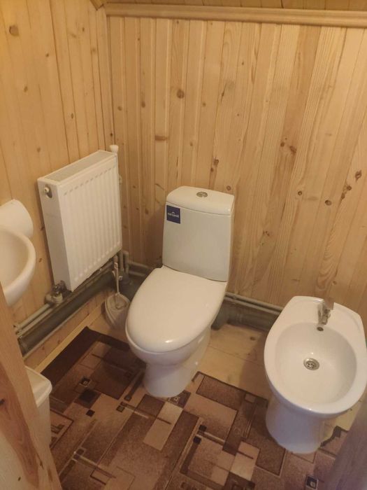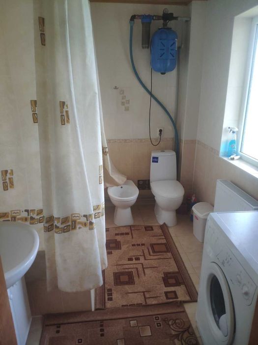 Тераса, передпокій, велика кімната, кухня, санвузол з ванною, біде та пральною машиною, перехід у цокольний поверх, де знаходиться котельня. 2 котли: газовий та для твердого палива.