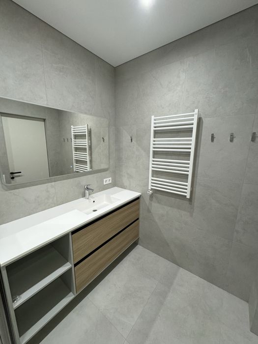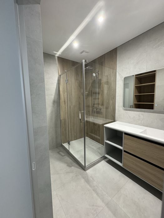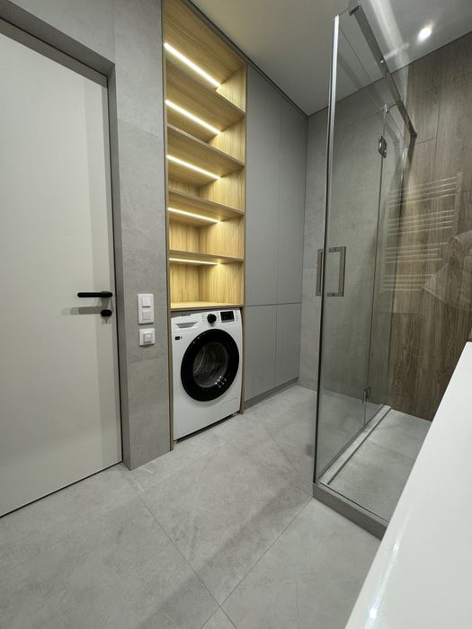 Душова (5,2 м²): душова, великий умивальник із тумбою, дзеркало з підсвіткою та електрична рушникосушарка. Прально-сушильна машини Samsung, бойлер на 80л.