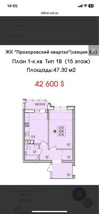 Квартира находиться на 15 этаже в секции 3.1