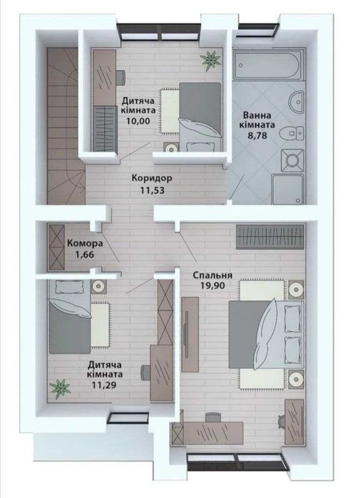 На другому поверсі 3 спальні (одна велика і дві менші), кладовка, великий санвузол.
